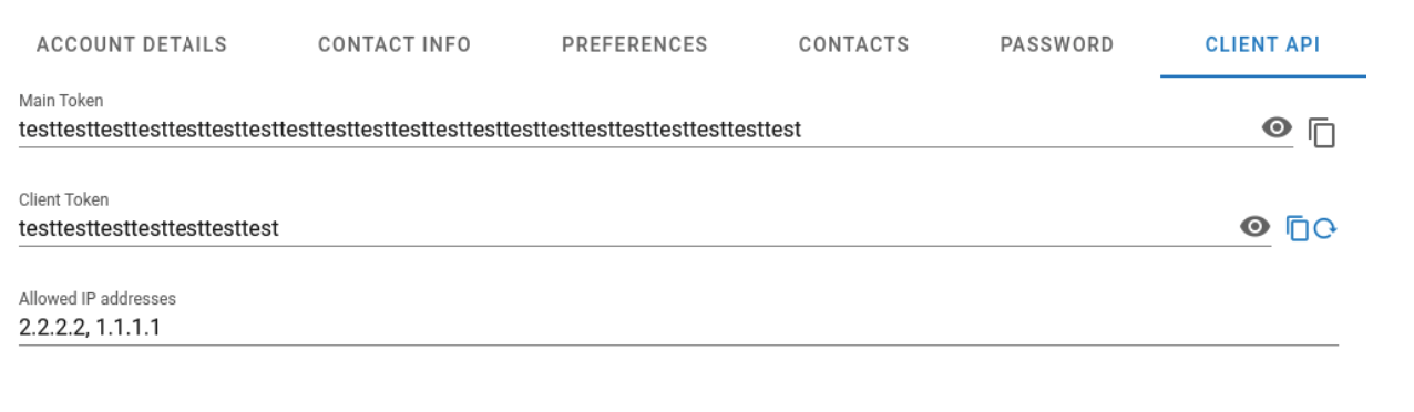 Once the support team enables the Client API, the main token is generated automatically. To access the main token, users can navigate to the Account Settings section of our My Account application. Within the Account Settings, locate the Client API tab, which is illustrated in the picture below.